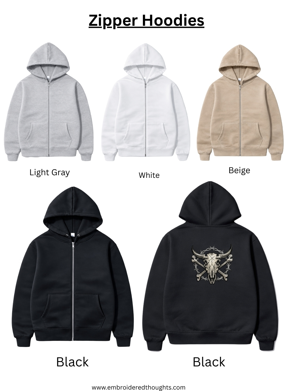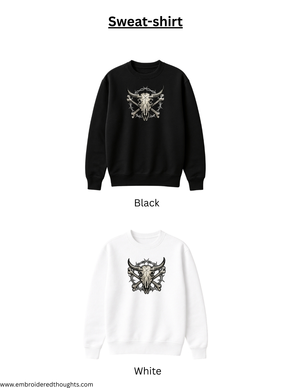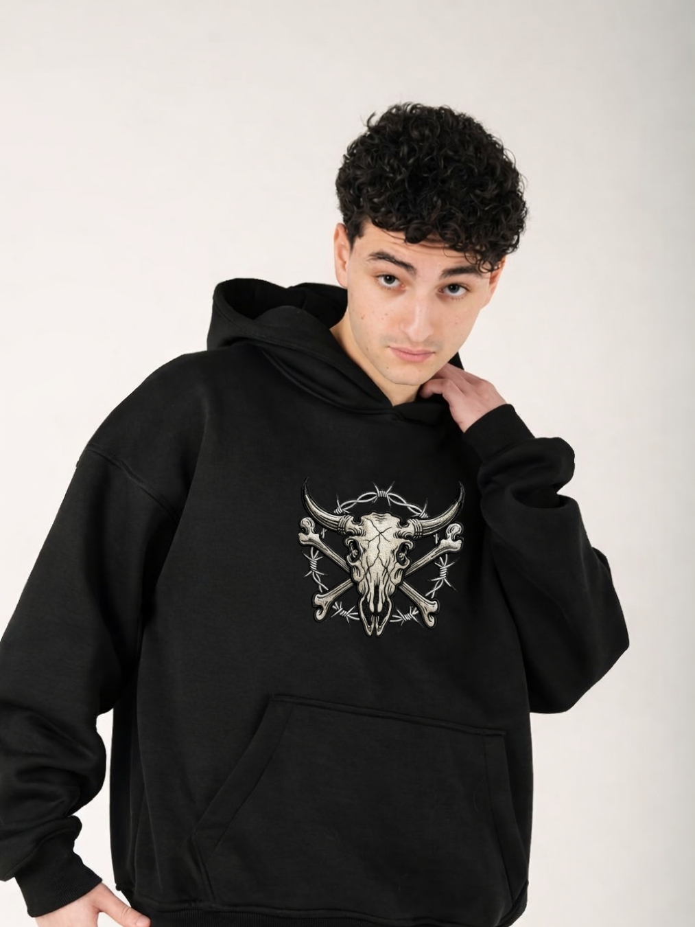 Finished with detailed embroidery, Buffalo Skull offers a strong stitched texture that stands out on regular fit t-shirts, drop shoulder t-shirts, hoodies, zip hoodies, and sweatshirts.