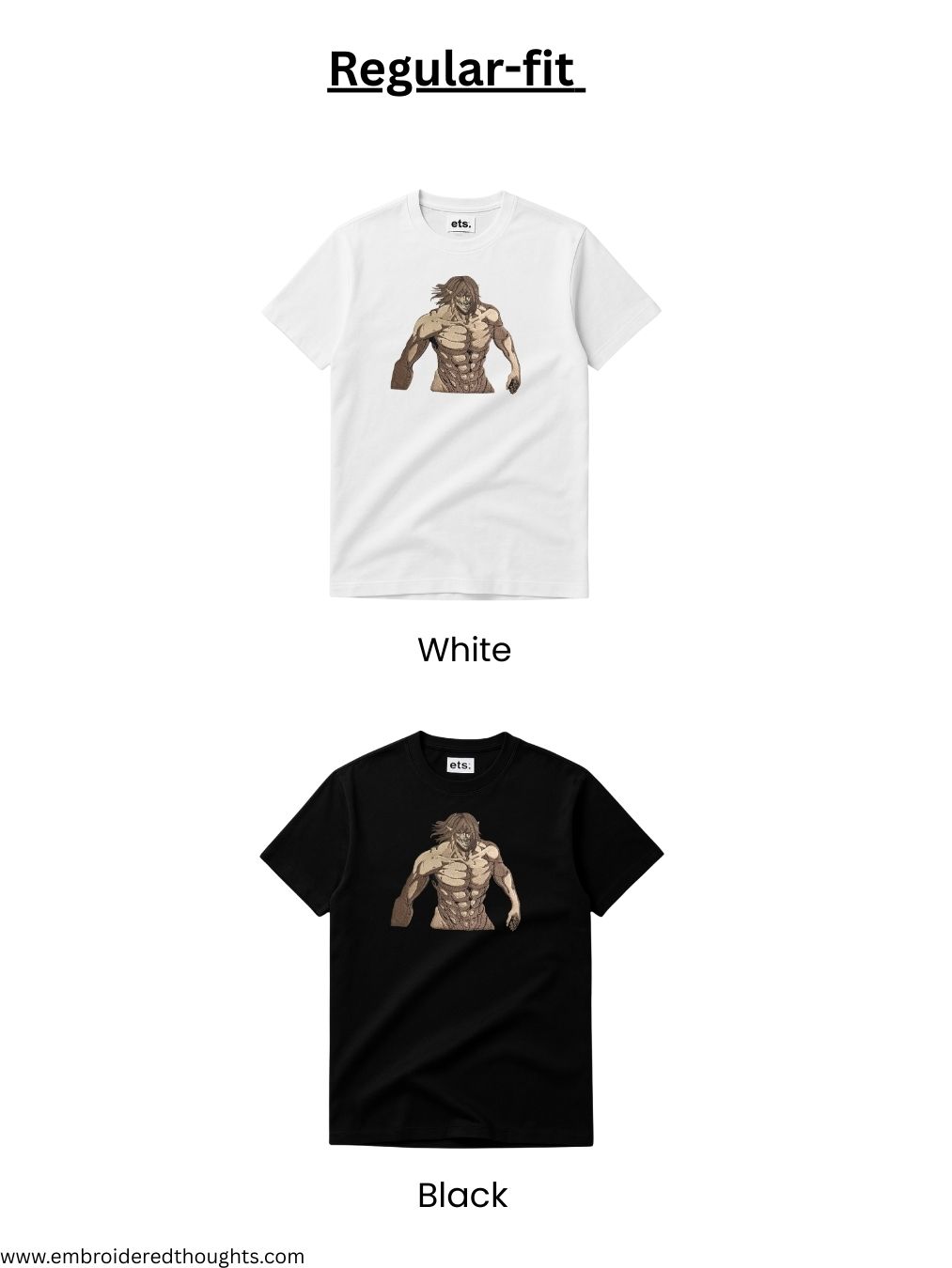 This Dark Titan embroidered design captures pure strength and dark energy through a clean but aggressive look. The sharp facial expression and strong body detailing give it a fearless anime presence. The embroidery work is premium and well-defined, adding depth and texture while keeping the design balanced and wearable.