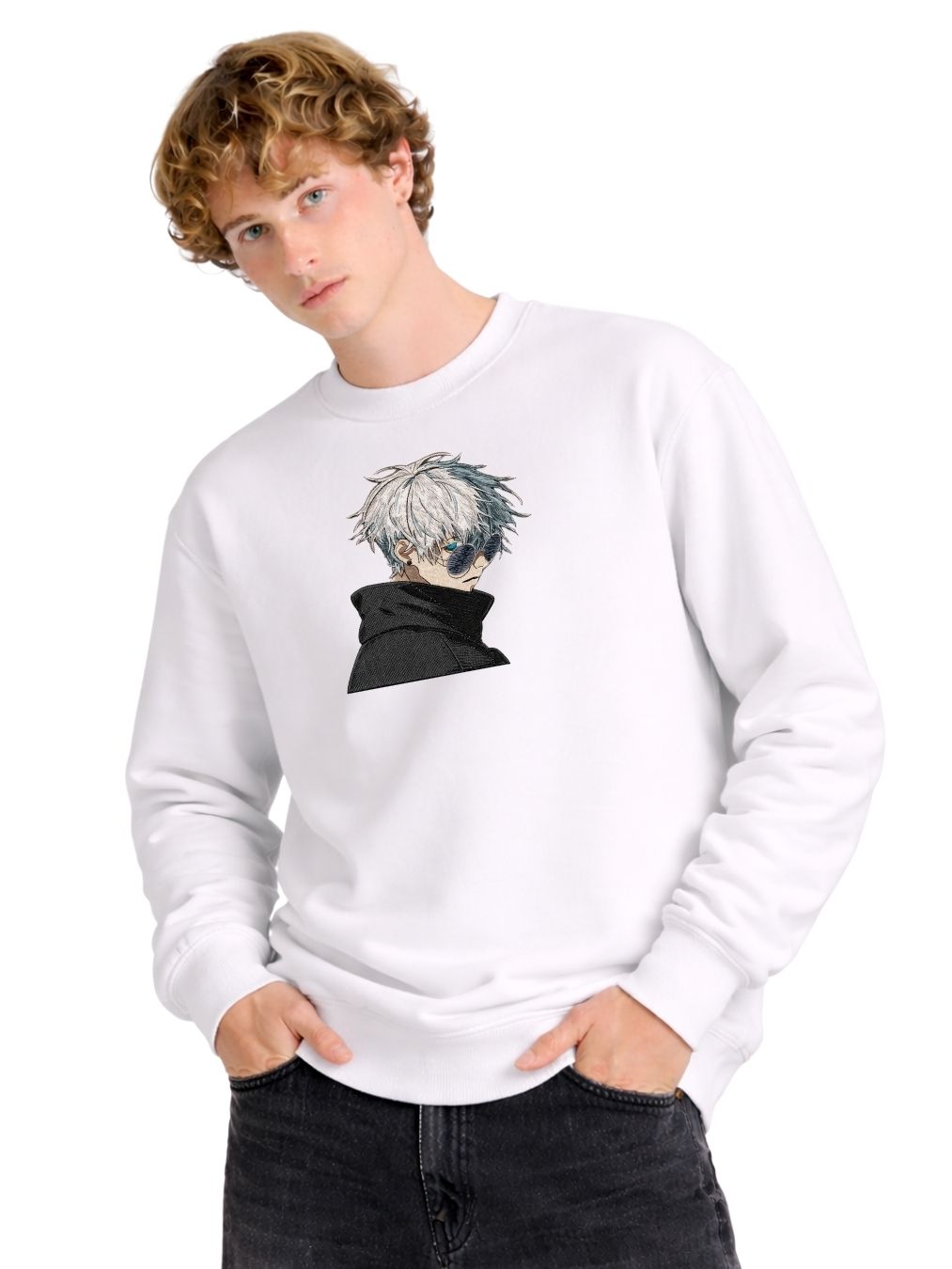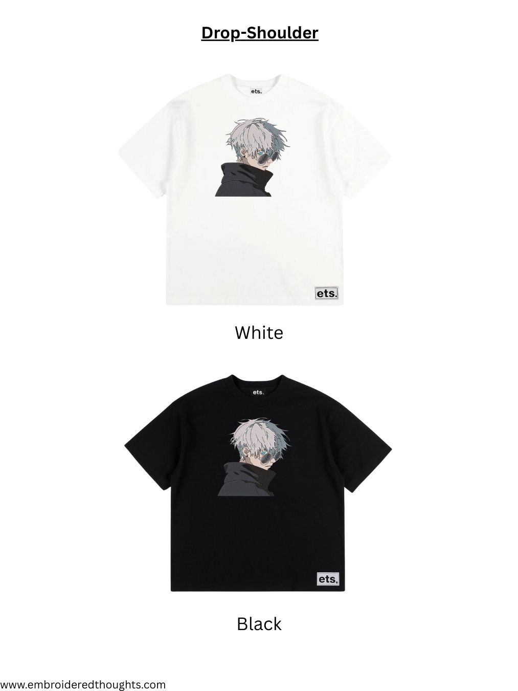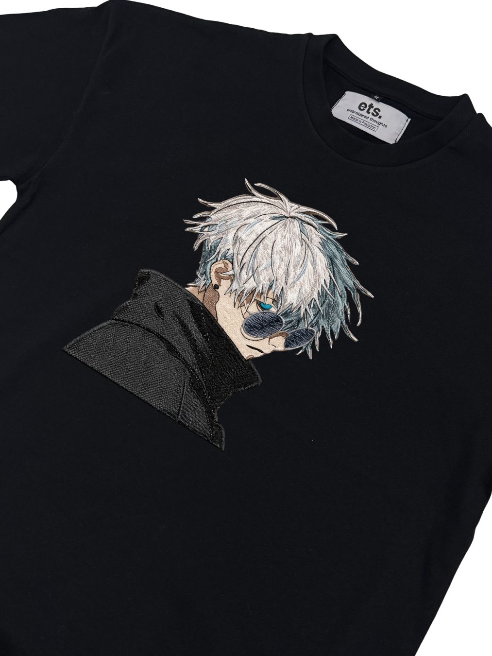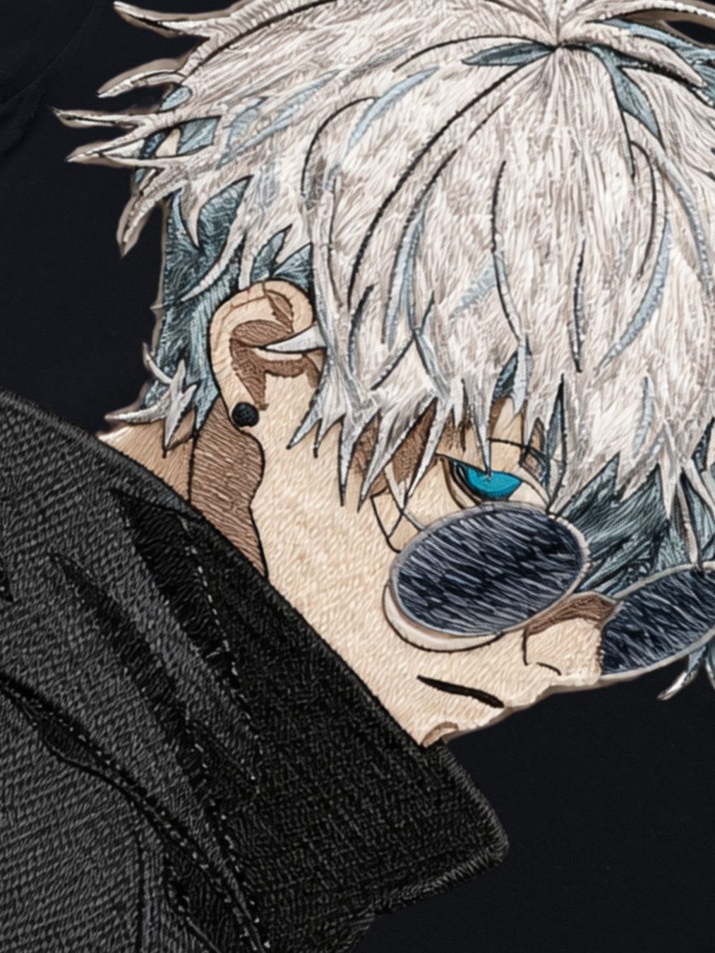 This embroidered design shows Gojo in a clean, minimal look with a cool and mysterious vibe. The side profile and calm expression give it a modern anime streetwear feel.