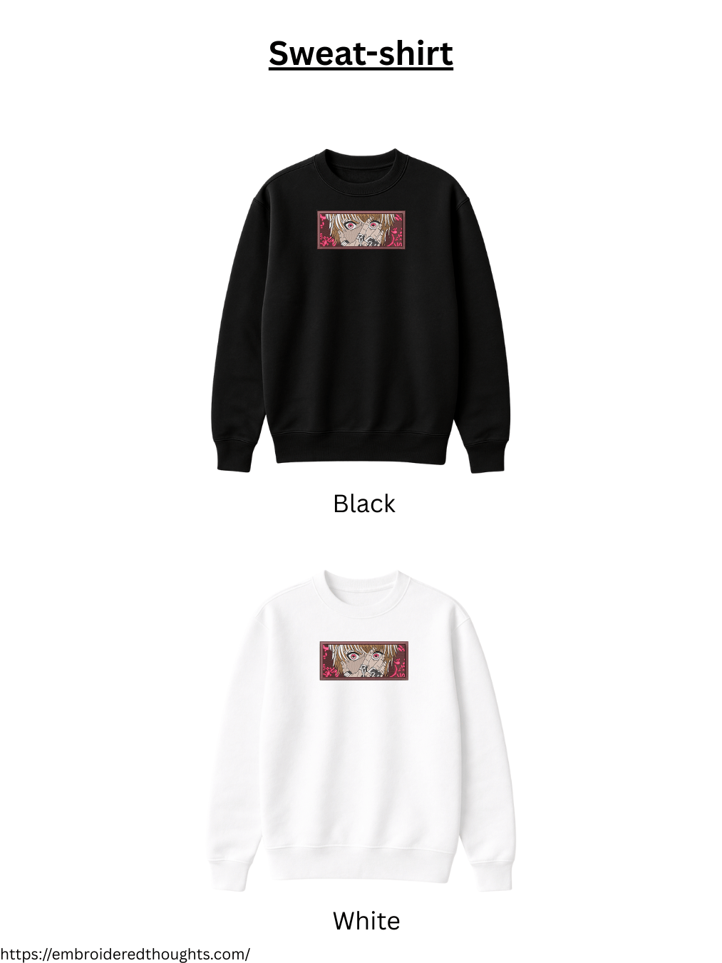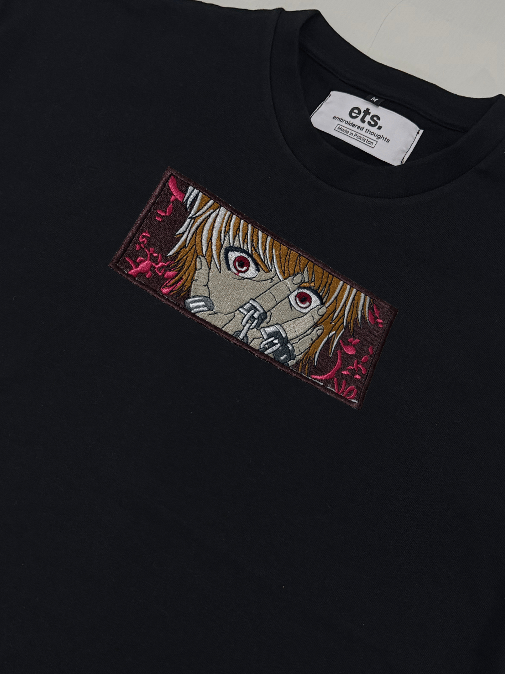 This design works perfectly on zipper T-shirts, drop-shoulder T-shirts, regular fit hoodies, and sweatshirts, making it an excellent choice for modern anime streetwear. The balanced color palette and rectangular framing give it a clean yet powerful look, ideal for both minimal and bold styling. It stands out beautifully on dark fabrics while maintaining a premium embroidered finish.
