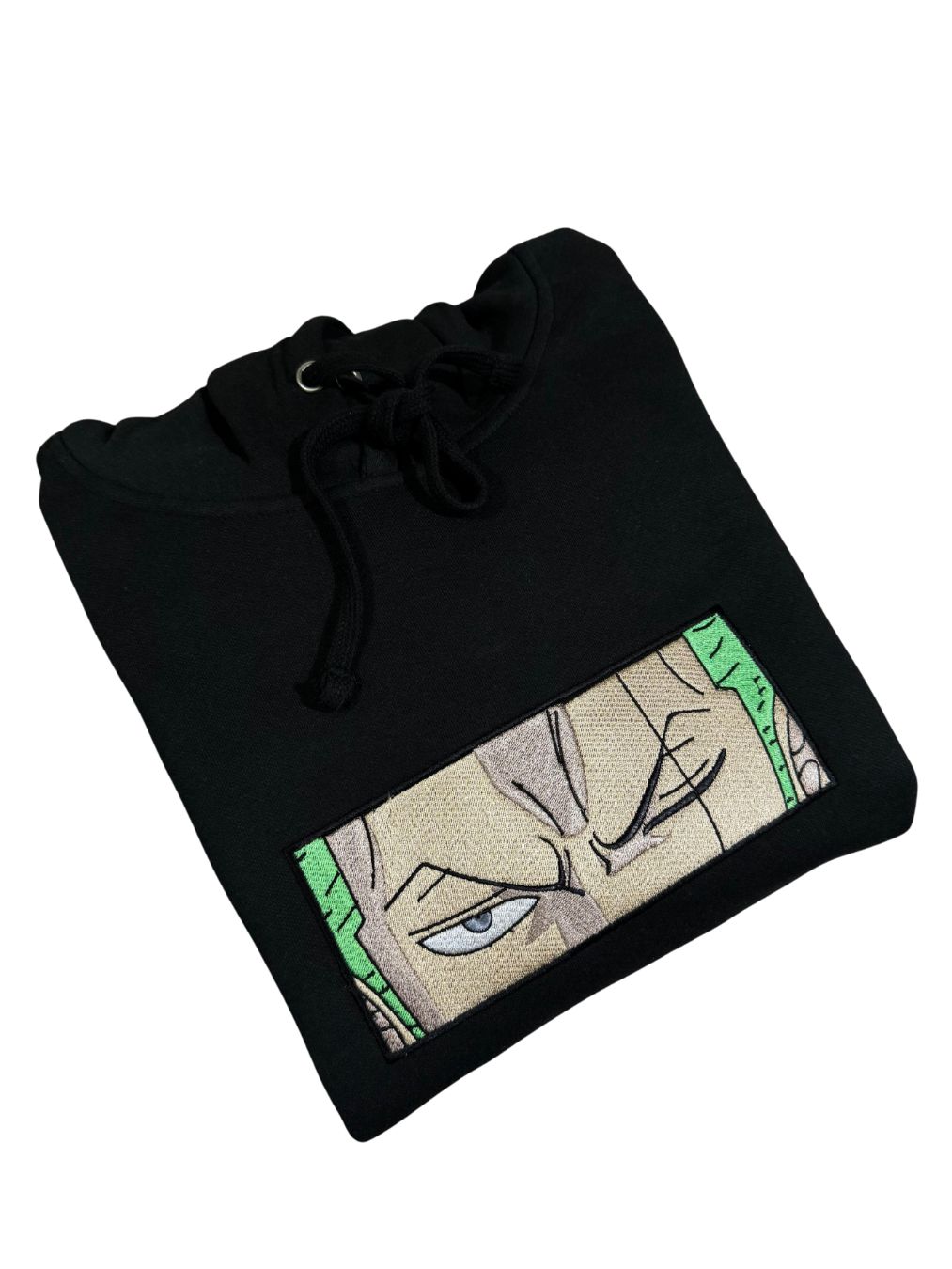 This embroidered design shows Roronoa Zoro’s intense eyes with a sharp, focused expression. The clean stitching and strong detailing give it a bold anime streetwear vibe that feels powerful but minimal.