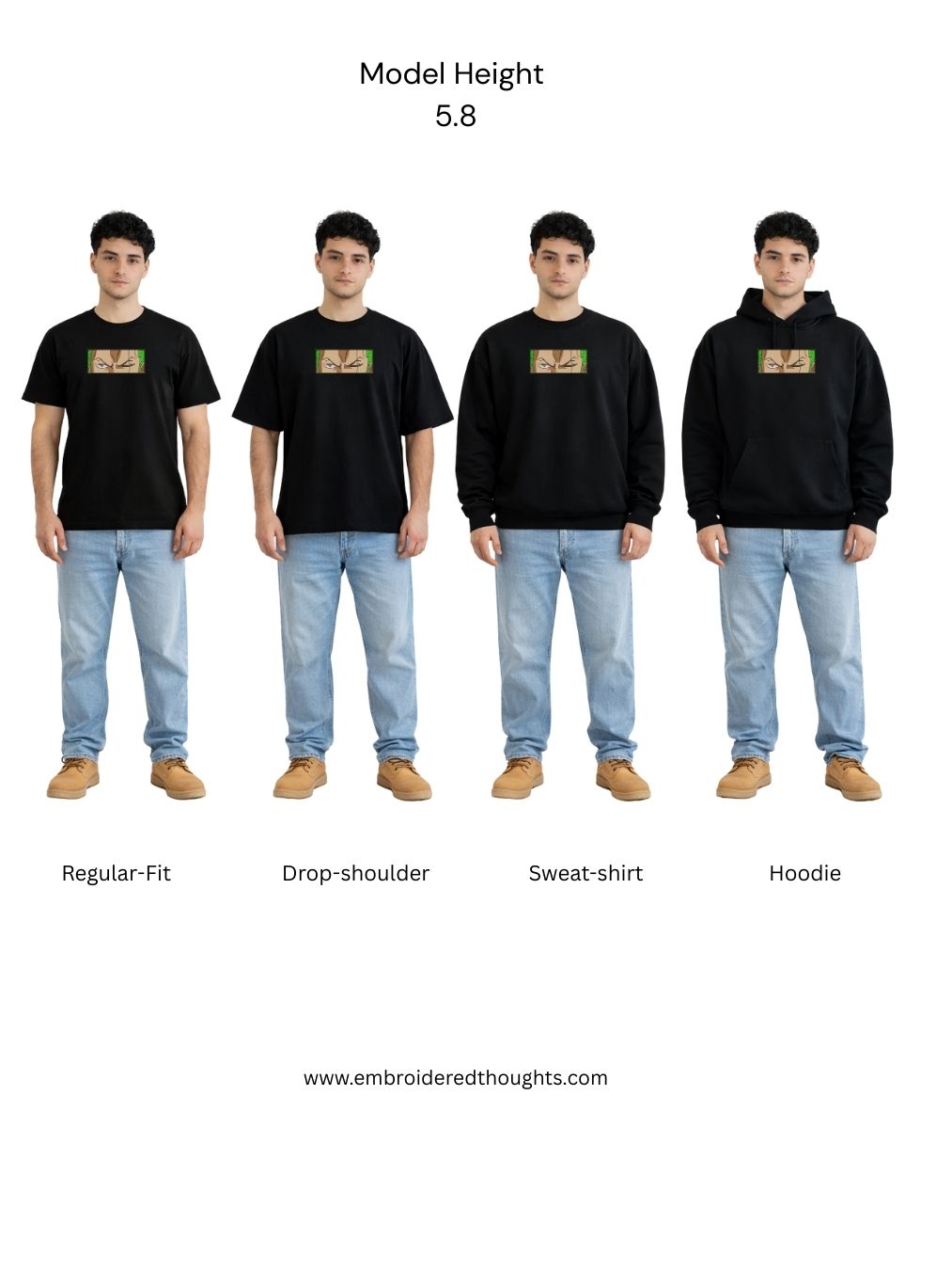The design fits perfectly on zipper T-shirts, drop-shoulder T-shirts, regular fit hoodies, and sweatshirts, making it easy to style for daily wear or anime street looks. It’s a great choice for Zoro fans who prefer a clean, powerful design that speaks through expression rather than heavy artwork.
